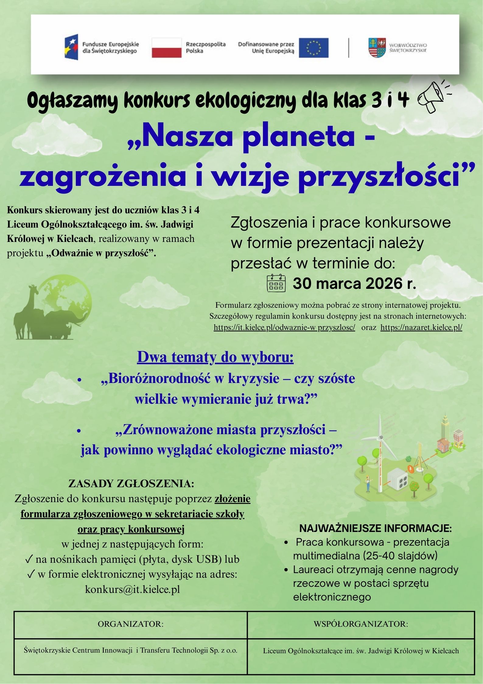 Zapraszamy uczniów klas III i IV- Liceum Ogólnokształcącego im. św. Jadwigi Królowej w Kielcach do udziału w konkursie ekologicznym realizowanym w ramach projektu „Odważnie w przyszłość”.
